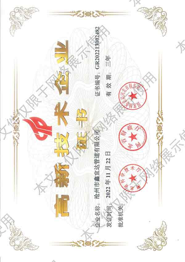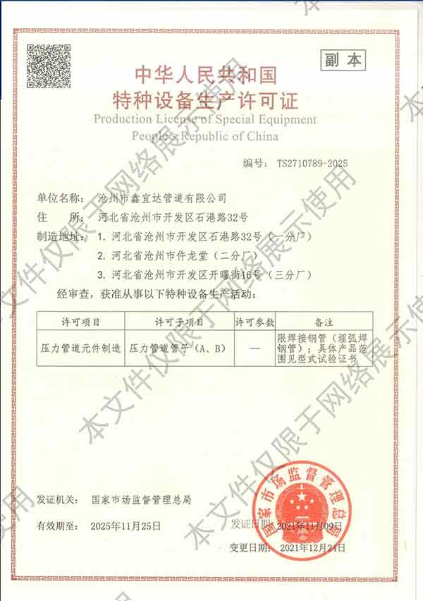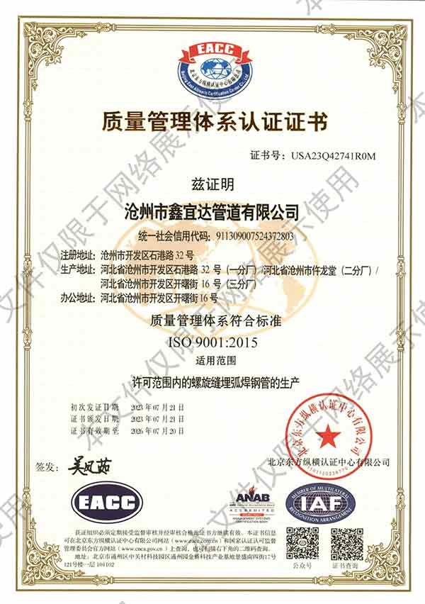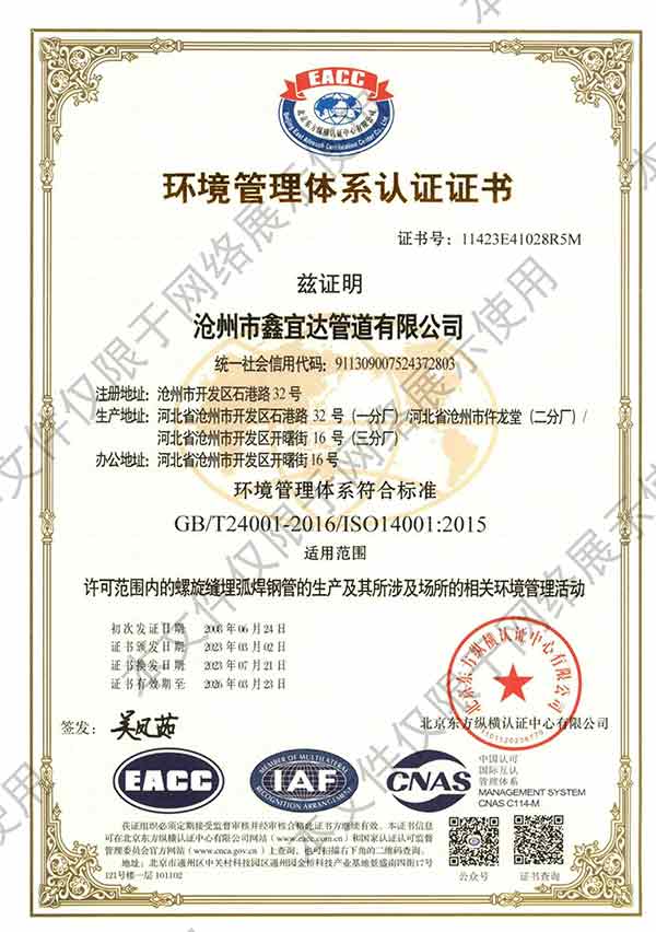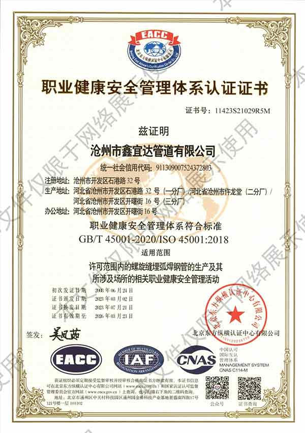 Cangzhou Xinyida Pipeline Co., Ltd. was established in July 2003 and is located in Cangzhou Economic Development Zone. It covers an area of 400000 square meters and has a registered capital of 181 million yuan. It is an industrial and commercial enterprise that integrates the production and anti-corrosion processing of spiral steel pipes, as well as the operation and sales of seamless steel pipes, coils, strip steel and other types of steel. The company currently has over 400 employees, including more than 120 personnel with intermediate and senior technical titles.